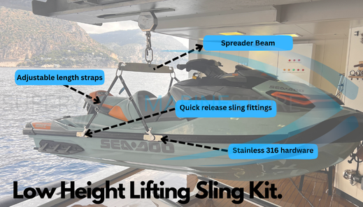 If your Seadoo is stored in a Garage or similar with restricted height lifting, then in order to have the correct (safe) lifting angle on the sling you will require a low height lifting kit including spreader beam.