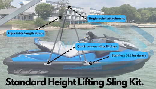 If your Seadoo is stored in a Garage or similar with restricted height lifting, then in order to have the correct (safe) lifting angle on the sling you will require a low height lifting kit including spreader beam.