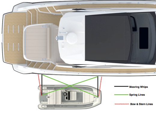 Each mooring whip base or mount should be located in line with the cleat on the tender. The further apart the attachment points are, the better. The poles should be perpendicular (at 90º) to the yacht and tender.
