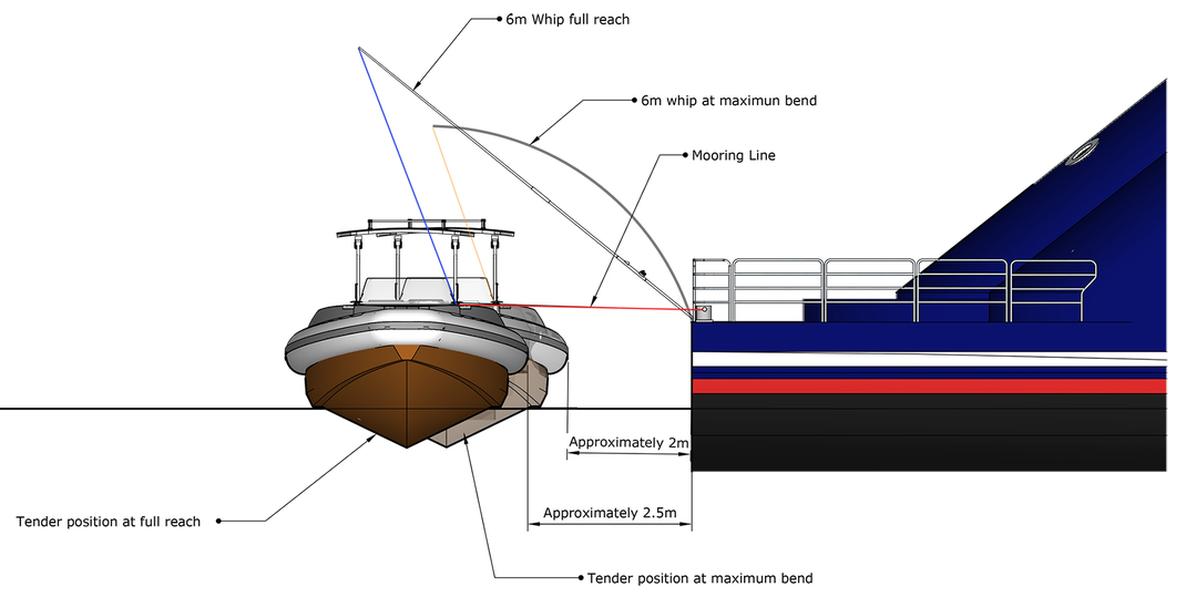 - Each mooring whip base or mount should be aligned with the tender’s cleat.