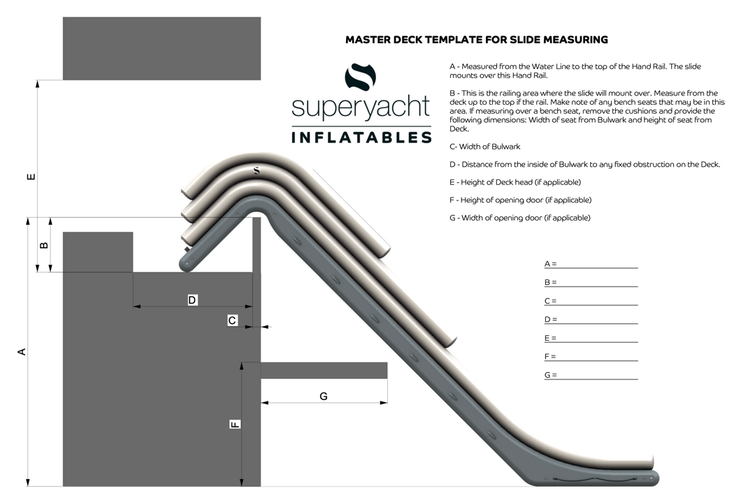 When considering an inflatable superyacht slide, it is important to choose a slide that is compatible with the size and design of your yacht. Factors such as slide length should be taken into account. It is recommended you consult with us to ensure you select the appropriate slide for your specific yacht requirements.